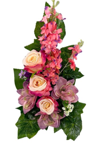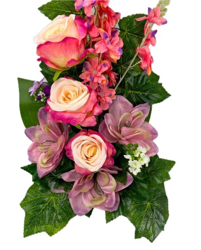 - wykonany ze sztucznych kwiatów w kolorze kremowo-różowym z bogatą zieloną roślinnością,