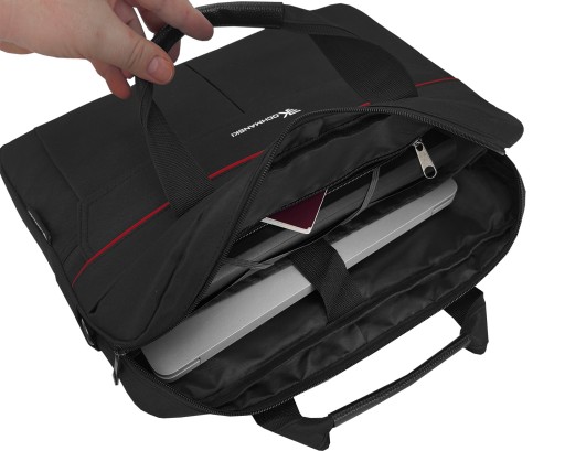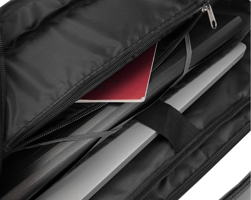 - specjalna gródź przeznaczona na laptopa 15,6 cala. Ścianki grodzi wyłożona poliestrową podszewką oraz wzmocniana pianką poliuretanową. Gródź posiada patkę zabezpieczającą laptop przed wysunięciem, zabezpieczaną na rzep,