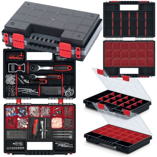 - Dzięki systemowi szczelnej pokrywy zawartość po przechyleniu nie wysypie się z swoich przegródek