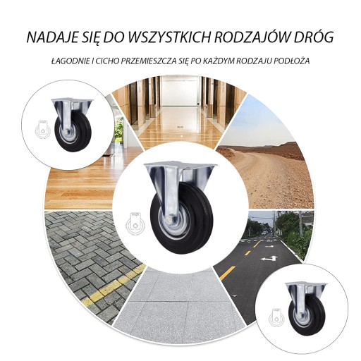 - KOŁO składa się ze stalowej piasty oraz z niebrudzącej gumowej opony, posiada łożysko igiełkowe. Kółka mają wytrzymałość po 100 kg na kółko. Wolno się zużywają, są odporne na uszkodzenie, amortyzują uderzenia i wibracje. Obracają się o 360 stopni ułatwiając manewrowanie meblami czy wózkiem. Gładko obracają się po twardych i gładkich powierzchniach jak beton przy bardzo małym tarciu.