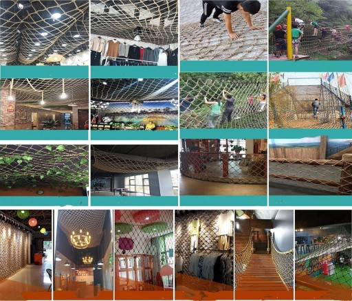 ★【Wewnętrzna lub zewnętrzna siatka dekoracyjna】 : wewnętrzna może być używana do dekoracji baru, kawiarni retro, siatki sufitowej, siatki ściennej do zdjęć, siatki na ubrania, przegrody pokojowej; Zewnętrzna może być używana do przedszkoli, parków rozrywki, obiektów użyteczności publicznej, ogrodzeń krajobrazowych, ochrony mostów wiszących, parków rozrywki z siatką linową, siatek do domków na drzewie i innych celów.