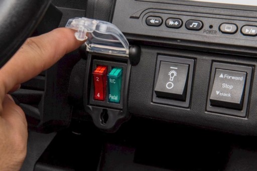 Pilot działający na częstotliwości 2.4 Ghz - z funkcją parowania - to oznacza że żadne inne urządzenia nie będą go zakłócały, pilot posiada 3 prędkości jazdy z pilota i funkcję natychmiastowego awaryjnego zatrzymania pojazdu - ( przycisk P, po jego naciśnięciu blokują się wszystkie funkcje manualne w pojeździe - jest to bardzo dobra funkcja jeśli musimy natychmiast zatrzymać pojazd i zablokować funkcje Małemu Kierowcy.
