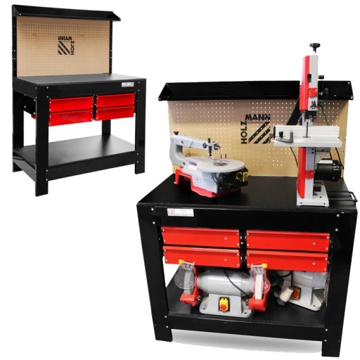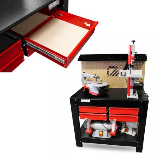 Pod blatem ze MDF-u znajdują się 4 szuflady w której można przechowywać niezbędne śrubokręty, klucze lub inne narzędzia.