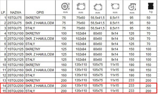 Zestaw składa się z czterech kółek wyposażonych w mocowanie na płytkę. W skład zestawu wchodzą dwa zestawy stałe o kodzie 3STGU200 (poz.15 w tabeli) oraz dwa koła skrętne z hamulcem o kodzie 2STGU200 (poz. 14 w tabeli).