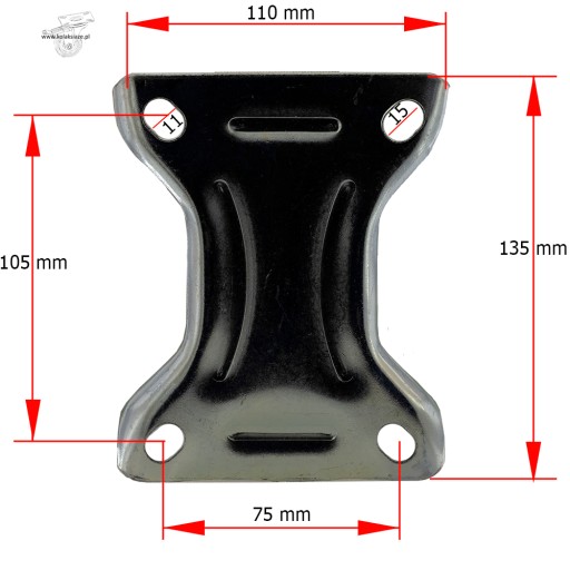 - OBUDOWY wykonane są blachy stalowej o dużej wytrzymałości. Płytka ma wymiary 135x110 mm. Kółka mają średnicę 200 mm, a centra mocowań mają wymiar 105 x 75 i owalne otwory do mocowania o wymiarach 11 x 15 mm. Wysokość całkowita wynosi 233 mm.
