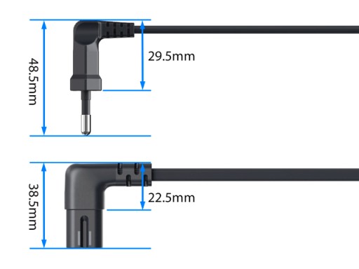 Obie wtyczki są kątowe, dzięki czemu możliwe jest zastosowania kabla wszędzie tam, gdzie brak miejsca utrudnia lub uniemożliwia zastosowanie kabla z wtyczkami prostymi (w sprzętach zawieszonych, dosuniętych do ściany, w gniazdach 230V z przysuniętymi meblami itp.). Wtyczki po włożeniu do gniazd "wystają" tylko 2.5~3cm zaś dzięki kątowemu wykonaniu nie narażają kabla na złamanie (co często się zdarza przy silnym wyginaniu kabla we wtyczkach prostych).