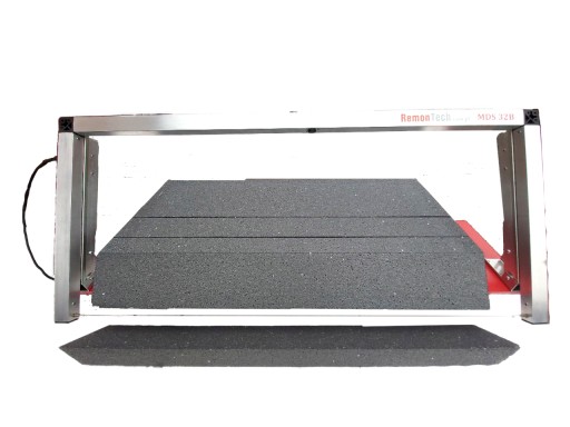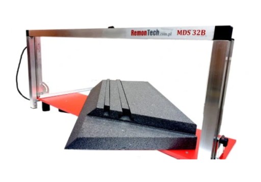 Maszyna do cięcia styropianu MDS 32B działa w pozycji poziomej. Dzięki temu urządzeniu możliwe jest wykonywanie cięć o grubości: 32 cm i długości 107 cm. To urządzenie realnie eliminuje nieczystości powstałe przy przycinaniu styropianu.