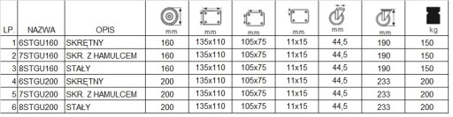 W skład kompletu wchodzą cztery koła mocowane na trzpień bez hamulca, o kodzie 6STGU200/37, w tabeli pod pozycją 4.