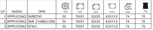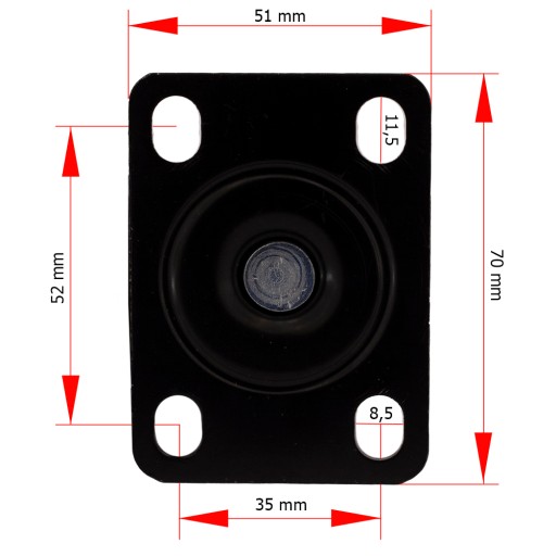 - OBUDOWY wykonane są blachy stalowej o dużej wytrzymałości. Płytka ma wymiary 70 mm x 51 mm. Kółka mają średnicę 50 mm, a centra mocowań mają wymiar 52 x 35 mm i owalne otwory do mocowania o wymiarach 8,5 x 11,5 mm. Wysokość całkowita wynosi 79 mm.
