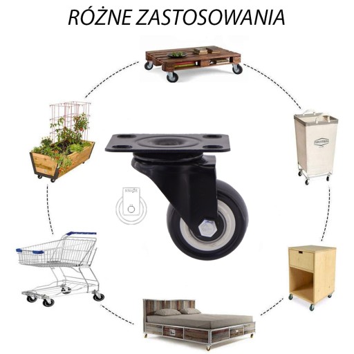 - KOŁO składa się z polipropylenowej piasty oraz z niebrudzącej poliuretanowej opony, posiada podwójne łożysko kulkowe. Kółka mają wytrzymałość po 70 kg na kółko. Wolno się zużywają, są odporne na uszkodzenie, amortyzują uderzenia i wibracje. Obracają się o 360 stopni ułatwiając manewrowanie meblami czy wózkiem. Gładko obracają się po twardych i gładkich powierzchniach jak beton przy bardzo małym tarciu.