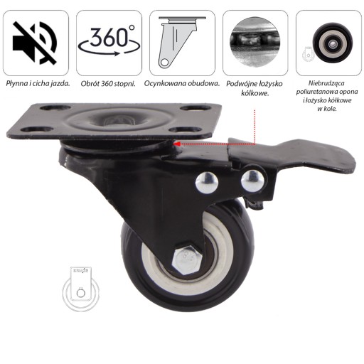 Koło składa się z polipropylenowej piasty oraz z niebrudzącej poliuretanowej opony, posiada podwójne łożysko kulkowe.