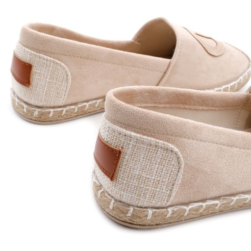 Espadryle damskie na płaskiej podeszwie. Czubek noska oraz boki ozdobiona plecionka z juty. Model wsuwany, wykonany z ekozamszu. Wyposażone w miękką wkładke- ekoskóra. Idealne na nadchodzącą porę roku.