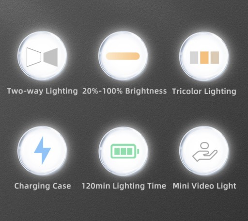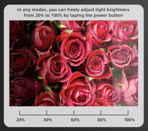 - Trzy Tryby Kolorów: Przytrzymaj przycisk, aby zmienić tryb: Zimne Światło-Ciepłe Światło-Światło Naturalne-Wyłączone. Dotknij przycisk, aby dostosować jasność od 20% do 100%.