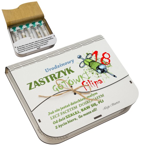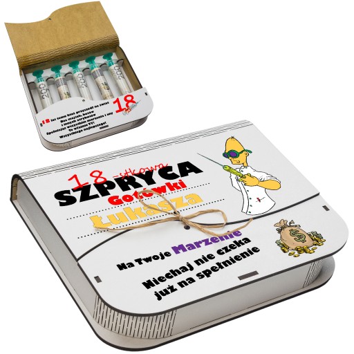Zastrzyk gotówki ŚMIESZNY PREZENT na 18 URODZINY pudełko na pieniądze