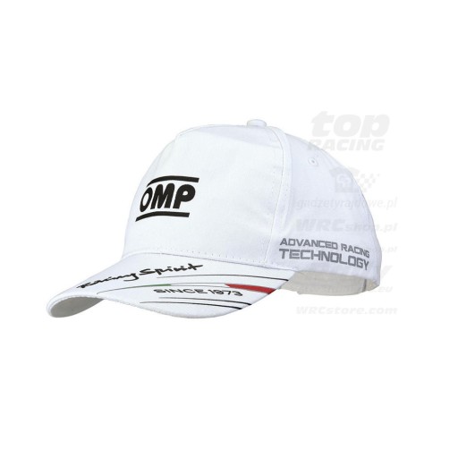 Duże logo OMP na przodzie czapki.