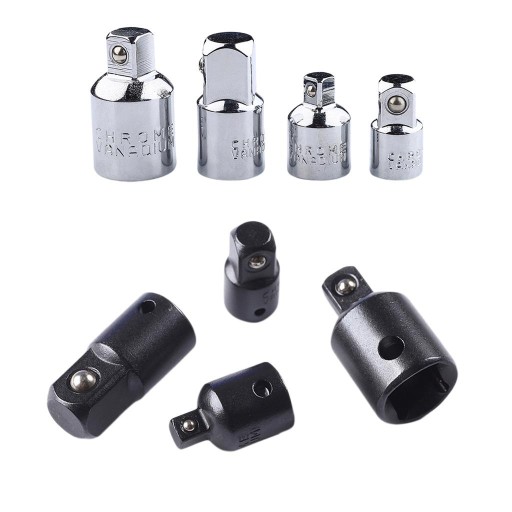 4-częściowy zestaw konwerterów zawiera rozmiary 1/2 cala (F) x 3/8 cala (M), 3/8 cala (F) x 1/4 cala (M), 3/8 cala (F) x 1/2 cala (M), 1/4 cala (F) x 3/8 cala (M)