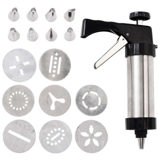 Maszynka do ciastek ze stali nierdzewnej to produkt od marki EH Excellent Houseware znanej z szerokiego asortymentu akcesoriów dla domu. Zestaw składa się z maszynki umożliwiającej wygodne wyciskanie ciastek, 8 nakładek do ciastek o różnych kształtach oraz 8 końcówek do dekorowania. Wystarczy umieścić w środku porcję ciasta lub lukru, wybrać odpowiednią końcówkę i gotowe! Korzystanie z maszynki jest niezwykle proste, dlatego do przygotowywania ciasteczek możesz zaprosić również dzieci, które na pewno będą się przy tym doskonale bawić!