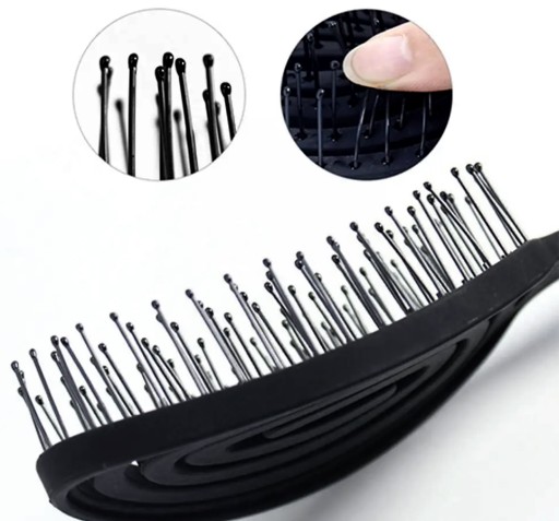 Powierzchnia rozczesująca szczotki jest odpowiednio szeroka, aby właściwie dopasowywać się do anatomicznych kształtów głowy. Szczotka posiada gęsto rozstawione nylonowe igiełki rozczesujące, zakończone kuleczkami, dzięki czemu są łagodne dla skóry głowy i dodatkowo ją masują.