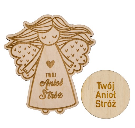 Piękny aniołek wykonany z naturalnego drewna z wygrawerowanym napisem "Twój Anioł Stróż"