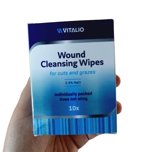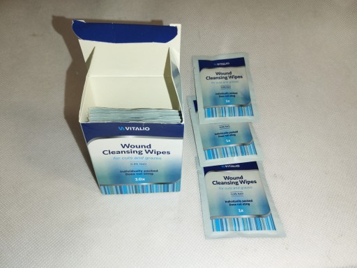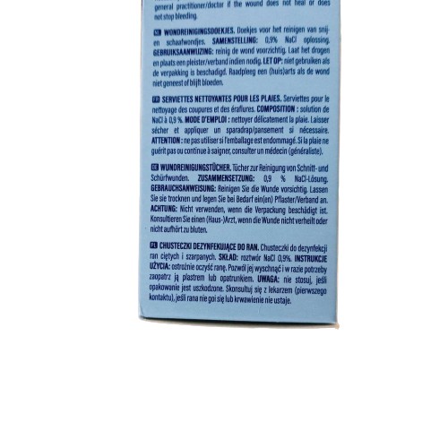 Każda chusteczka zawiera roztwór NaCl 0.9%, który doskonale sprawdza się przy ranach ciętych i szarpanych.