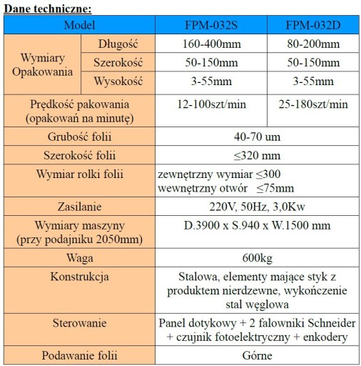 Prędkość pakowania : 12-100szt/min FPM-032S, 25-180szt/min FPM-010D (opakowań na minutę)