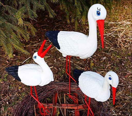 Nasze bociany są produkowane z tworzywa sztucznego odpornego na warunki atmosferyczne .