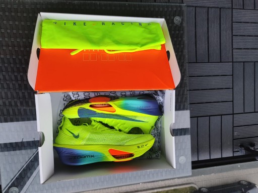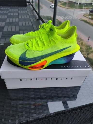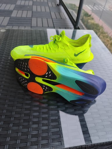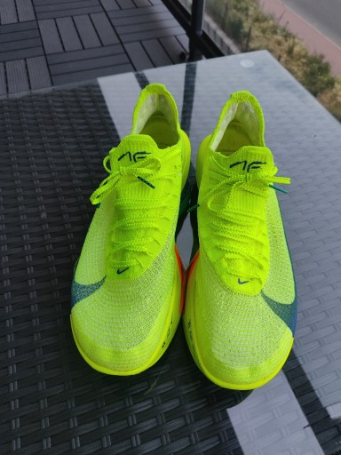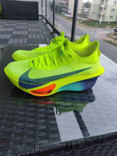 Witam przedstawiam fantastyczne buty Nike Alphafly 3, zakupione w maju tego roku, rozmiar wkładki 30 cm, płytka kabronona. Model przygotowany dla najlepszych maratończyków na świecie uwzględniający ich sugestie przy tworzeniu tego modelu. Przebiegłem w nich 23 km, niestety jako biegacz amator nie jestem w stanie wykorzystać ich potencjału i musiałem przejść na trochę inny model. Wymieniona wkładaka na bardziej oddychająca. Buty w wyśmienitym stanie, przebiegłem ten krótki dystans po bieżni, dlatego ślady użytkowania są minimalne
