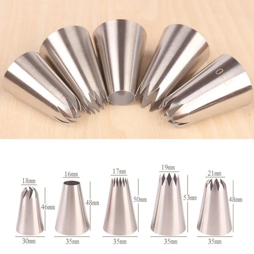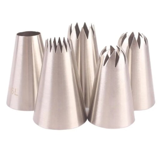 Metalowe końcówki do efektownej i szybkiej dekoracji ciast i kremów. Służą do wykonywania dekoracji w kształcie kwiatów, róż, gwiazdek, dużych kropek.
