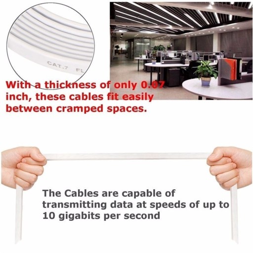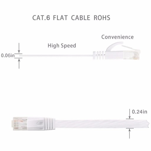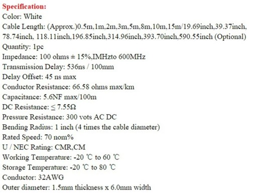 Kolor: biały Długość kabla: (ok. )0,5 m 1,5 m 2 m 3 m 5 m 10 m 15 m 20 m (opcjonalnie) Ilość: 1 szt. Impedancja: 100 omów ± 15%, IMHz do 600 MHz Opóźnienie transmisji: 536 ns / 100 mm Przesunięcie opóźnienia: maksymalnie 45 ns Rezystancja przewodu: 66,58 omów maks./km Pojemność: 5,6 NF max/100m Rezystancja DC: ≤ 7,55 Ω Odporność na ciśnienie: 300 V AC DC Promień zgięcia: 1 cal (4-krotność średnicy kabla) Prędkość znamionowa: 70 nom% Wartość U / NEC: CMR,CM Temperatura pracy: -20 ℃ do 60 ℃ Temperatura przechowywania: -20 ℃ do 80 ℃ Przewód: 32AWG Średnica zewnętrzna: grubość 1,5 mm x szerokość 6,0 mm