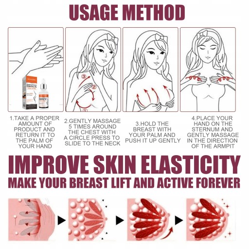 Sposób użycia : Raz rano i raz wieczorem. , Podgrzej piersi ciepłym ręcznikiem przed i po użyciu. , Nakładaj równomiernie po obu stronach klatki piersiowej. , Unikaj otoczki. , Przesuń ręce po obwodzie klatki piersiowej. Koło od zewnątrz do wewnątrz , Masuj przez 10-15 minut aż do wchłonięcia.