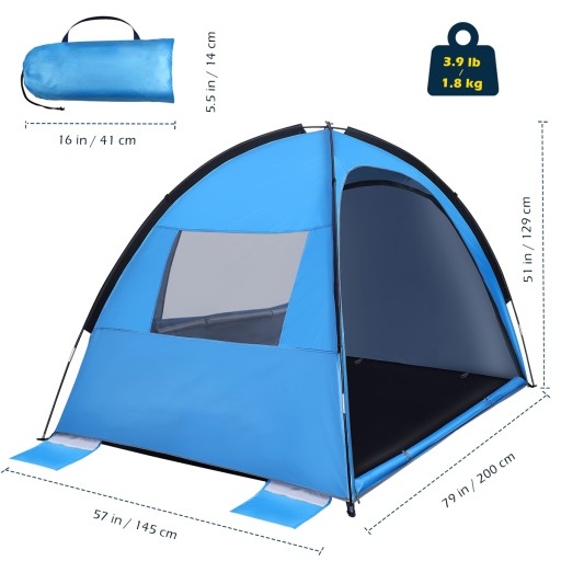 Ten namiot plażowy wykonany jest z tkaniny pokrytej powłoką anty-UV, która zapewni Tobie i Twojej rodzinie silną ochronę przed słońcem podczas wakacji nad morzem. Jest lekki i można go złożyć do niewielkich rozmiarów, przenośny do podróży na zewnątrz. Dzięki przejrzystym instrukcjom użytkowania można go łatwo złożyć i zdemontować.