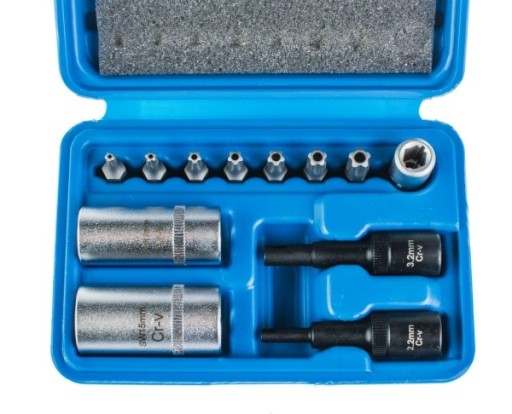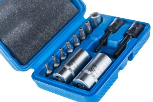 Zestaw kluczy oraz bitów do zaworów w instalacji klimatyzacji samochodowej. Klucze posiadają specjalną zabezpieczoną konstrukcję: nasadki 8-kątne w rozmiarze 12 i 15 mm, nasadki ampułowe 2,2 i 3,2 mm oraz bity pięciokątne TORX5 w rozmiarach TS10, TS15, TS20, TS25, TS27, TS30, TS40