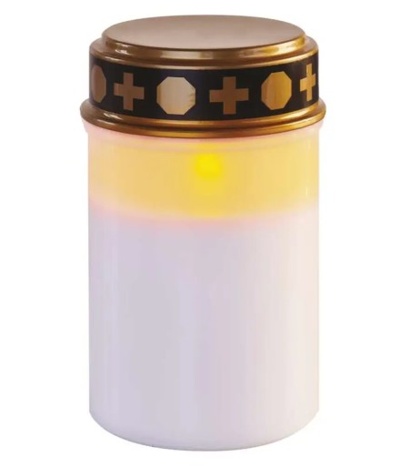 Znicz na baterie led wodoodporny w kolorze białym. Lampka cmentarna zasilana 2 bateriami typu C może świecić nawet do 1500h na jednym komplecie baterii . Produkt posiada podwyższony stopień szczelności IP44 - dzięki czemu spwadzi się dobrze w warunkach zewnętrznych. Znicz led świeci delikatnym żółtym światłem i mocy ok 0,06W- 1 dioda led. Wymiary lampionu z tworzywa sztucznego to 7x12,5 cm. Świeczka cmentarna led posiadawbudowany timer