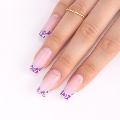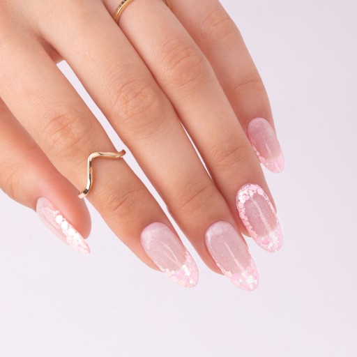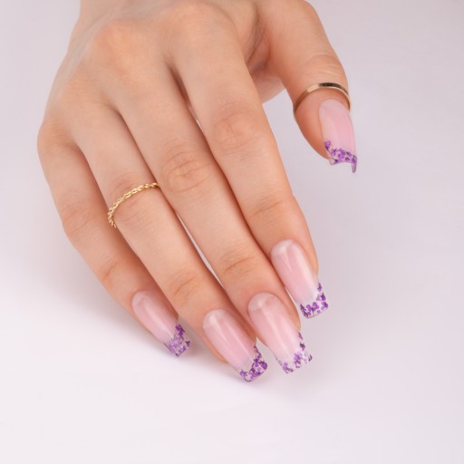 - Przygotuj szablon w taki sposób, aby idealnie pasował do wolnego brzegu. Nałóż żel na formę i paznokieć, cienką warstwą nadając odpowiedni kształt i długość. Pamiętaj, że Gel in Bottle to nie produkt do ekstremalnych długości. Max 2cm. Utwardź w lampie.
