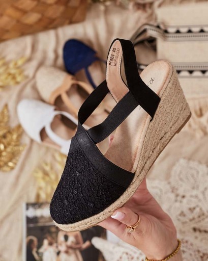 Damskie sandały a'la espadryle na koturnie wykonane są z tkaniny zdobionej koronką, wkładka to skóra ekologiczna. Obuwie wsuwane, posiada elastyczne gumki. Must have tego sezonu!