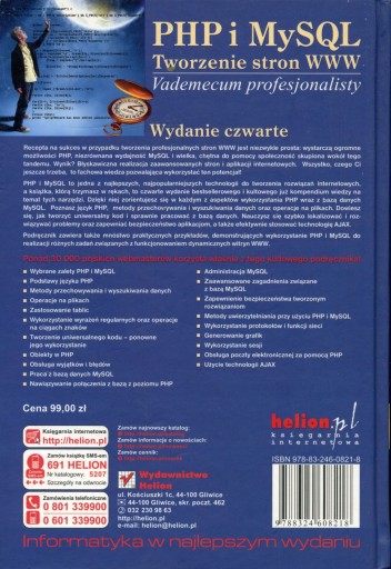 Kolejne, uaktualnione wydanie najbardziej znanego, bestsellerowego podręcznika dla webmasterów na temat tworzenia dynamicznych witryn internetowych! Ponad 30 000 sprzedanych egzemplarzy poprzednich wydań!!! Recepta na sukces w przypadku tworzenia profesjonalnych stron WWW jest niezwykle prosta: wystarczą ogromne możliwości PHP, niezrównana wydajność MySQL i wielka, chętna do pomocy społeczność, skupiona wokół tego tandemu. Wynik? Błyskawiczna realizacja zaawansowanych stron i aplikacji internetowych. Wszystko, czego Ci jeszcze trzeba, to fachowa wiedza, pozwalająca wykorzystać ten potencjał!