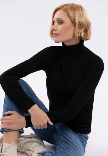 Czarny sweter z golfem ma dopasowany krój i podkreśla sylwetkę. Rękawy wykończone zostały szerokimi, prążkowanymi ściągaczami. Cały fason jest prosty, elegancki i uzupełniony biżuteryjnym detalem Volcano.