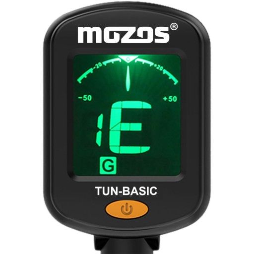 Precyzyjne strojenie instrumentu jest absolutną koniecznością. Nasz tuner kompatybilny jest z gitarami klasycznymi, akustycznymi, basowymi, elektroakustycznymi i elektrycznymi. Stroik sprawdzi się w także z ukulele i skrzypcami. Stroik jest bardzo prosty w użytkowaniu dzięki jednemu przyciskowi. Mozos Tun-Basic wyposażony też jest w ekran LCD z 2 kolorami podświetlenia (zielony-dostrojony, biały-rozstrojony). Dzięki obrotowej konstrukcji (dwuosiowej) ergonomia używania produktu jest na wysokim poziomie. Duży klips montażowy ułatwia aplikację na różnych gryfach oraz umożliwia używanie tunera w niesprzyjających warunkach akustycznych (np. na scenie w trakcie koncertu). Niewielki rozmiar i duża dokładność przy tak konkurencyjnej cenie gwarantuje zadowolenie z zakupu. Pojedyncza bateria litowa CR2032 zapewnia nieprzerwany czas pracy do 24 godzin, a funkcja automatycznego wyłączania oszczędza żywotność baterii, gdy tuner jest bezczynny.