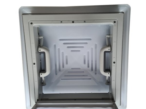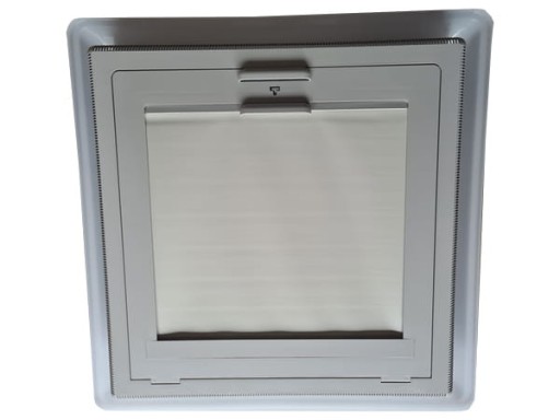 Okno dachowe MPK 46K 40x40 duża pokrywa renomowanej firmy MPK. Okno idealnie nadaje się do zastosowania w przyczepie kempingowej lub kamperze. Okno posiada większą pokrywę górną w stosunku do standardowego okna mpk. Dolna ramka w kolorze szarym. Okno było stosowane np. w przyczepach marki Knaus.