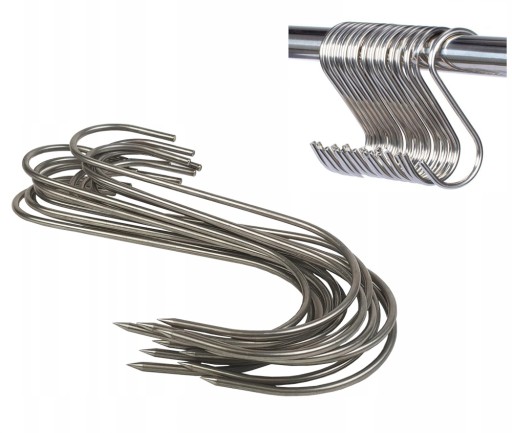 Haki typ "S "do zawieszania wyrobów mięsnych w wędzarniach -–wykonane ze stali nierdzewnej. Łatwe w utrzymaniu czystości .