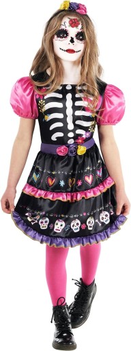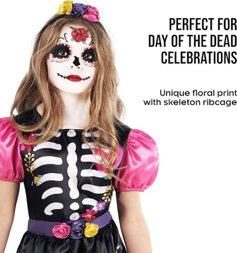 - Świętuj dzień zmarłych w wielkim stylu dzięki tej dziewczęcej sukience z okazji Dnia Zmarłych. Zawiera satynową sukienkę z bufiastymi rękawami i nadrukiem szkieletu oraz dopasowaną różową satynową opaskę na głowę