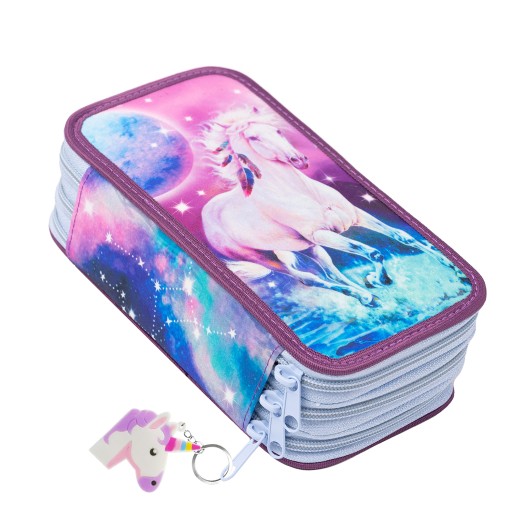 - Posiada duże trzy komory - z gumkami na ok. 35 kredek, długopisów, flamastrów, linijkę, kątomierz itp.
