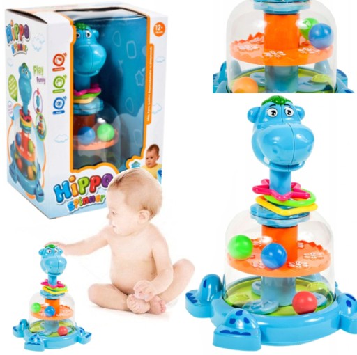 - Po naciśnięciu na główkę hipcia kręcą się kuleczki znajdujące się w środku zabawki