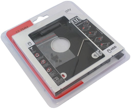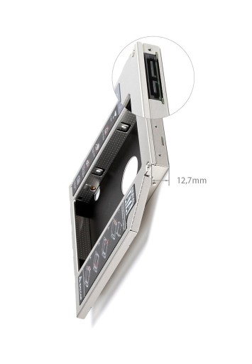 Aluminiowa kieszeń na dodatkowy dysk HDD 2,5'' cala SATA albo SSD 2,5''. Kieszeń umieszczana jest w obudowie notebooka w standardowym miejscu montażowym stacji dysków CD/DVD SATA o grubości 12,7 mm. Urządzenie jest zgodne ze standardami SATA I, II, III oraz kompatybilne z większością dostępnych na rynku notebooków, posiadających napęd optyczny CD/DVD w standardzie SATA.