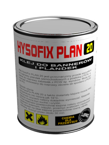 HysoFix PLAN 20 to wysoce skuteczny klej przeznaczony głównie do naprawy plandek samochodowych i banerów wykonanych z polichlorku winylu (PCW). Jest on również znakomity w naprawach obuwia z podeszwami z PCW lub poliuretanu (PU), a także zabawek i innych przedmiotów z tych materiałów.