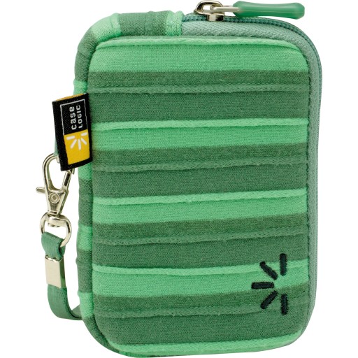 Zielony pokrowiec firmy Case Logic, bardzo stylowy, dwukolorowy case z dzianiny, który idealnie nadaje się do małych aparatów fotograficznych, słuchawek dousznych, ładowarek, lub innych urządzeń elektronicznych o podobnych rozmiarach.