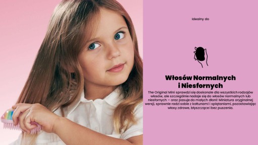 Szczotka do każdego rodzaju włosów. Łagodnie i bezboleśnie rozczesuje splątane kosmyki bez ciągnięcia i wyrywania. Rozmiar szczotki idealny dla dzieci.
