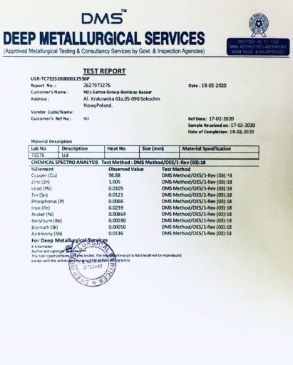 Materiał wykonania: 98,88% miedź, 1,005% cynk i pierwiastki śladowe poniżej 0,003%