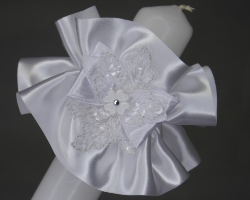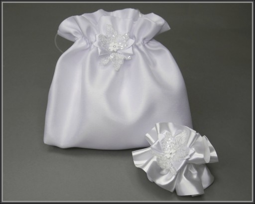 Komplet komunijny w składzie: Torebka z satyny atłasowej odszyta na matową stronę, rękawiczki pięciopalczaste oraz okapnik na świecę Wszystkie elementy zestawu ozdobione zostały koronkową aplikacją z odrobiną srebrnej nitki.