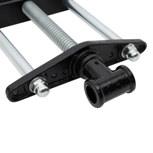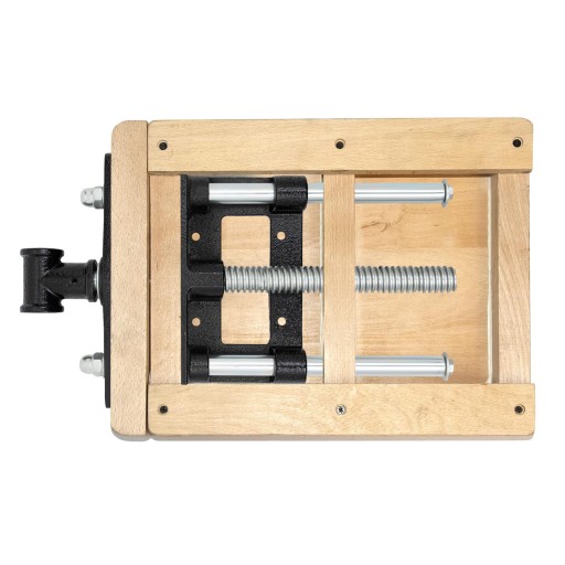 Solidna płyta z żeliwa ciągliwego montowana jest do spodu blatu. Dwie stalowe prowadnice oraz gruba śruba trapezowa umożliwiają płynną regulację i równomierne dociskanie. Pierwszą powierzchnię zaciskową stanowi krawędź stołu, a druga montowana jest na przedniej szczęce imadła.